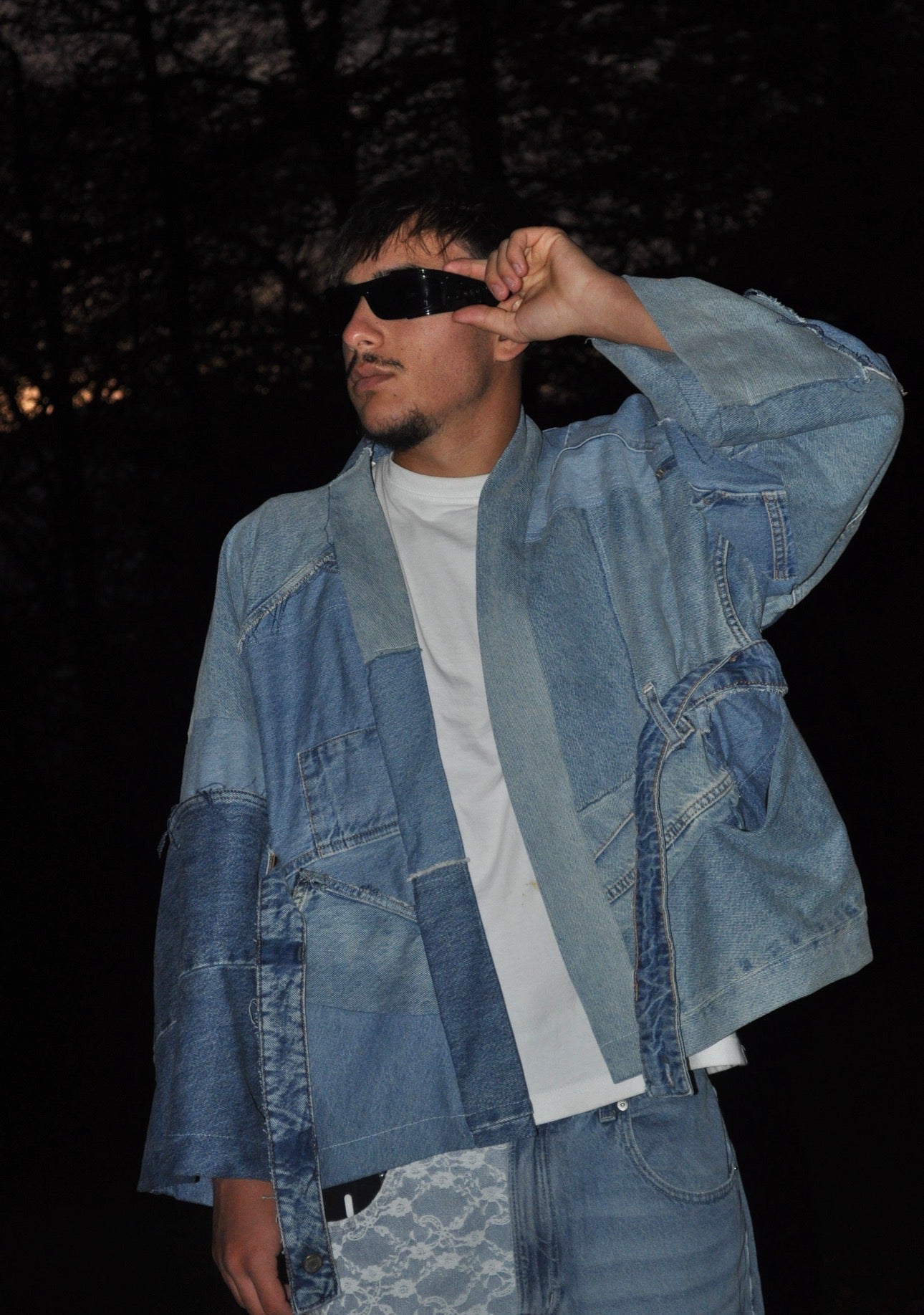 Ce kimono a été confectionné à partir de plusieurs jeans afin d'amener cet aspect déstructuré. Il a été confectionné en 1 exemplaire uniquement, c'est une taille L qui peut être portée par des personnes faisant du M ou du XL.